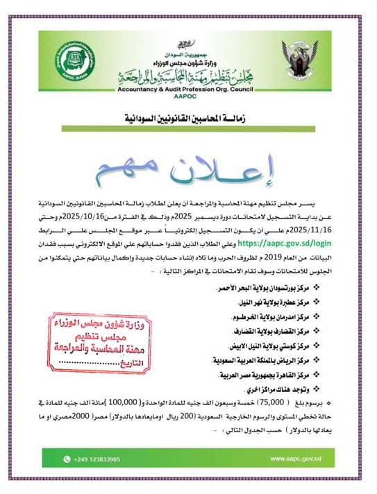 للإنضمام الرجاء إرسال الأسم رباعي عبر رابط الواتسابيقــدم مجلس تنظيم مهنة المحاسبة والمراجعة بالتعــاون مع الدكتور / يوسف ادم ورشة عمل عن معيار المحاسبة الدولي رقم IAS1يــوم السبت الموافق : 30/11/2024م Online عبر تطبيق Zoom الساعة السابعة مساء الدعوة لكل الممارسين لمهنة المحاسبة والمراجعة .