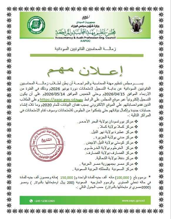 في اطار برامج لجنة التدريب بالمجلس وسعى اللجنة لإتاحة التدريب لكافة خريجي اقسام المحاسبة بالجامعات وبالتعاون مع مركز NNK للمحاسبة والمراجعة والاستشارات المالية نعلن عن إقامة كورس اعداد الموازنة يوم 20/3/2019بمقر المركز بالخرطوم 2 شارع 47 عمارة فاروق الطابق الثاني علما بان الترشيح لهذا الكورس تم بناء على أولوية التسجيل لدى سكرتارية لجنة التدرب بالمجلس وعليه سيتم الاتصال واخطار المرشحين لهذه الدورة وسيتوالى الترشيح للكورسات والدورات وفقا للتسجيل لدى السكرتارية.
