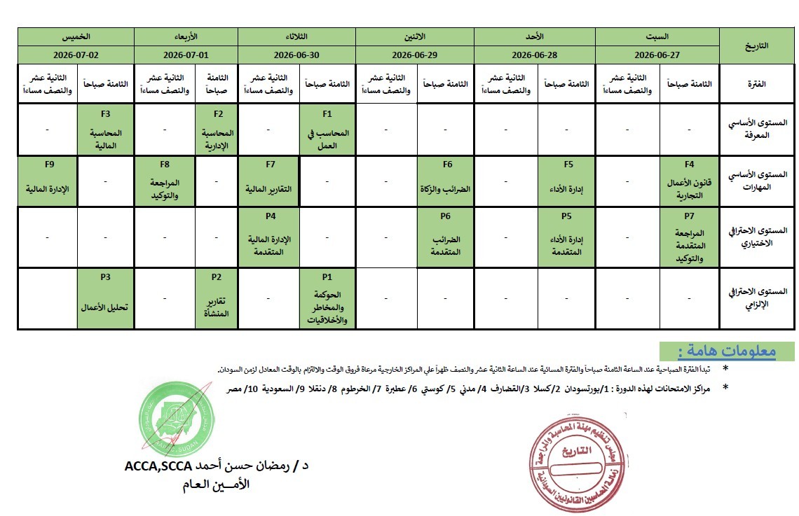 مراكز الإمتحان لدورة ديسمبر 2025 هي:الخرطوم بورتسودان ،عطبرة ،القضارف ، كسلا، كوستي، مدني، دنقلا، السعودية، القاهرة، وتوجد مراكز اخري تحدد لاحقا.